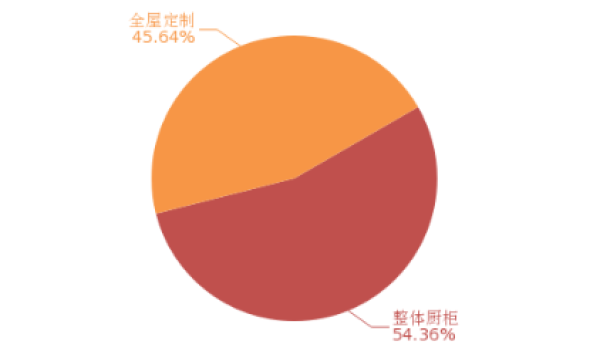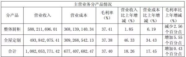 从产品类别来看,“整体厨柜”、“全屋定制”是企业营业收入的主要来源。具体而言, “整体厨柜”营业收入为5.9亿,营收占比为54.4%。“全屋定制”营业收入为4.9亿,营收占比为45.6%。