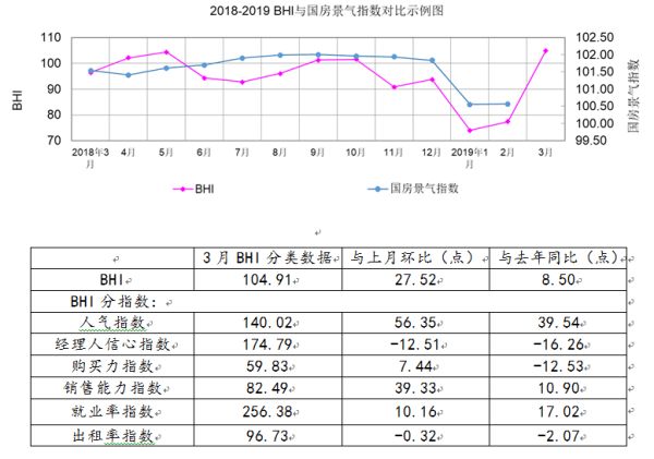首先,分析全国房地产市场情况,3月全国各地房地产市场调控政策逐渐平稳,购房者怕踏空的心理加成季节性因素使得市场预期回暖,新房、二手房市场整体表现均比前两月明显好转。据中国指数研究院发布的3月份百城住宅价格指数显示,3月全国100个城市(新建)住宅平均价格为14759元/平方米,环比上涨0.24%,涨幅较2月扩大0.14个百分点。3月房地产开发企业推盘节奏明显加快,重点城市供给量有所回升,市场整体去化效果较好,重点城市整体成交量有所回升。全国二手房市场也多项指标向好,一线城市及热点二线城市楼市成交集体回暖。但在当前“因城施策”政策背景下,3月市场同比回升力度相对温和,市场并未出现大幅反转,且三四线城市“跌多涨少”,楼市分化加剧。与之对应的全国建材家居市场表现类似,3月市场迎来2019年第一个促销季,加上今年以来国家支持实体经济发展的简政减税降费政策逐步落地,消费热情有所拉动,BHI环比上涨达27.52点,但行业整体仍处于经济“新常态”下的L形底部波动状态,并未大幅反转。