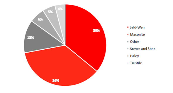 数据显示,2015年美国国内销售住宅木门约6000万套,前两大木门寡头Jeld-Wen与Masonite在北美市场份额合计就超过70%。