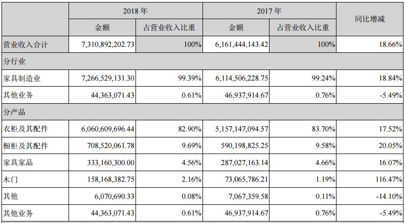 2018年,江山欧派实现营业收入12.83亿元,同比上升27.05%;归属于上市公司股东的净利润1.55亿元,同比上升12.97%。其2018年营收、利润增速均低于2017年(分别为31.74%和25.76%)。