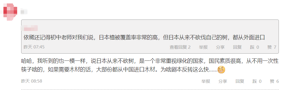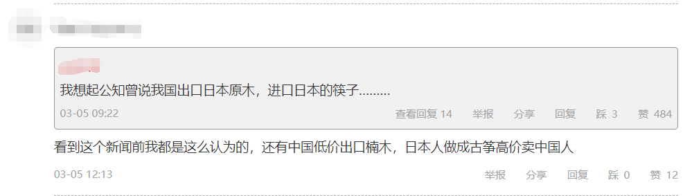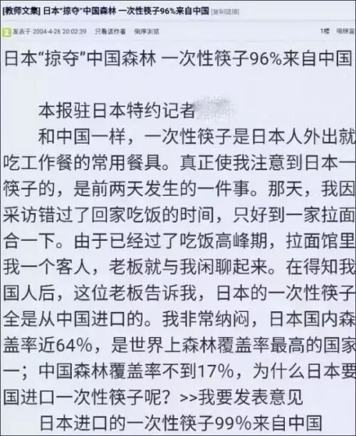 “日本从不生产一次性筷子,完全依赖进口,有百分之九十以上的一次性筷子来自于中国。而且日本人还注意一次性筷子的回收,回收后制成纸浆, 再出口到纸浆紧张的中国。这就是日本森林覆盖率高的原因。”