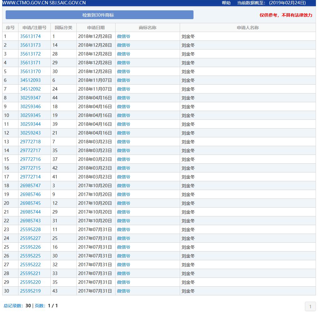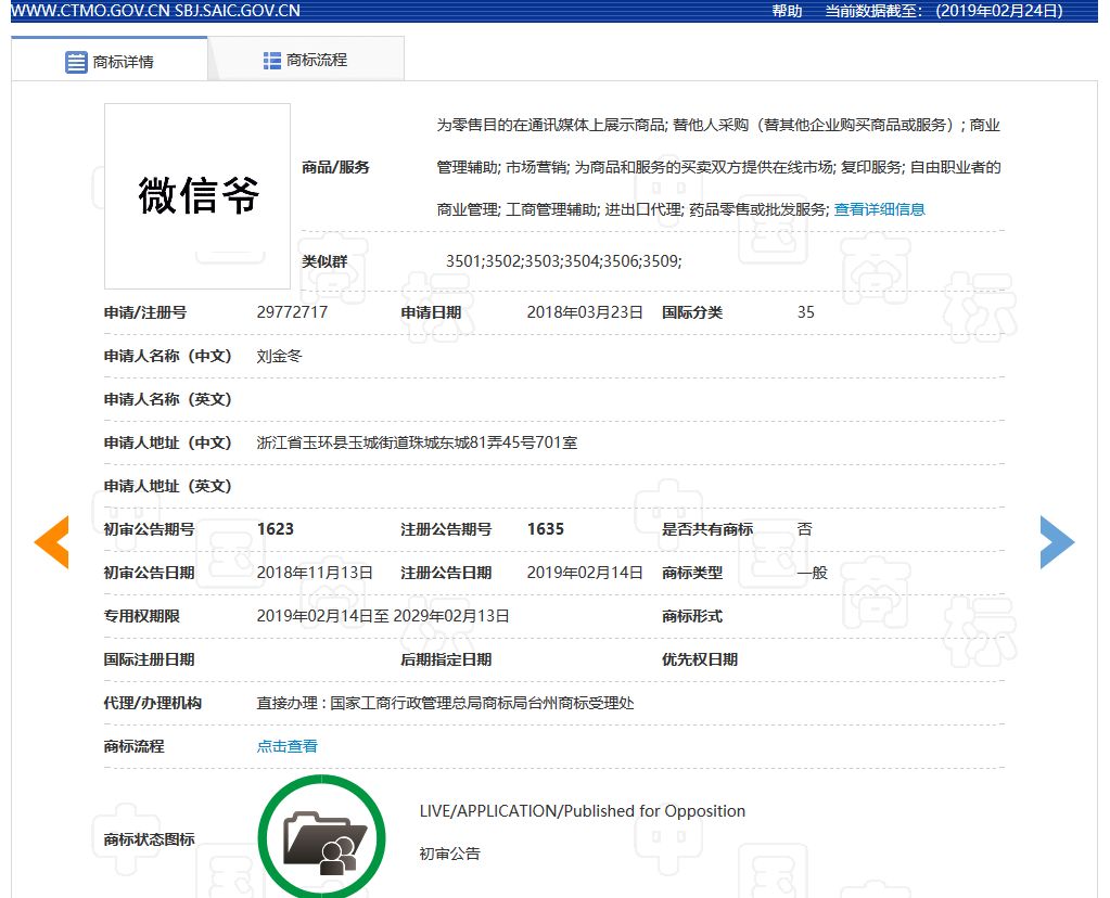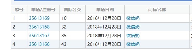 可以看出,申请人并非是一时兴起的注册。从2017年7月开始,直到2018年末,一年半的时间里陆陆续续的提交了几次申请,目前已经申请了30个类别的“微信爷”,而且大部分已经初审公告。
