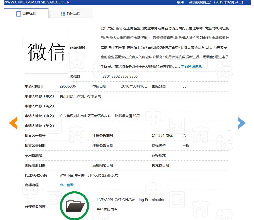 与之相对的是,同样在2018年3月份,甚至比“微信爷”的提交日期还早了一个星期,腾讯多次申请未成功、心心念念的35类“微信”商标却至今还未初审公告。