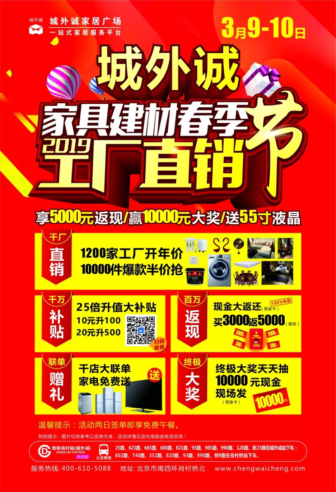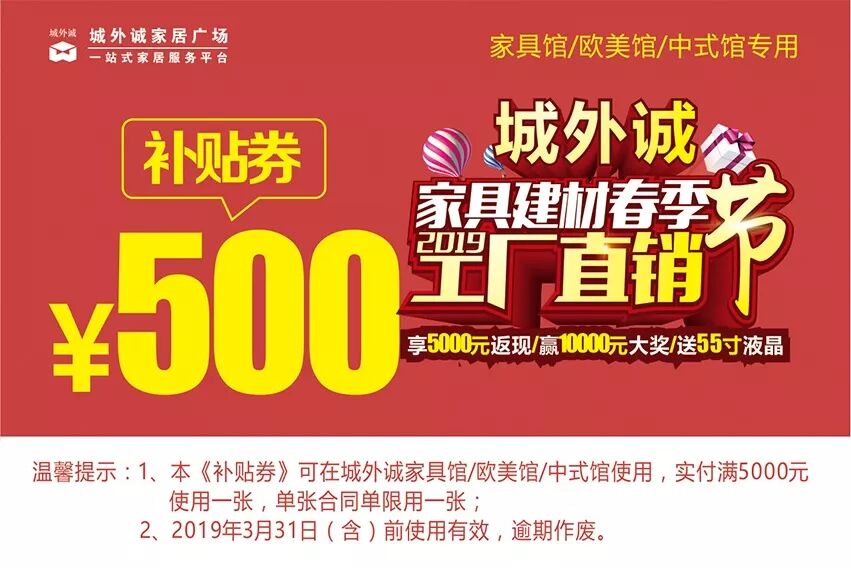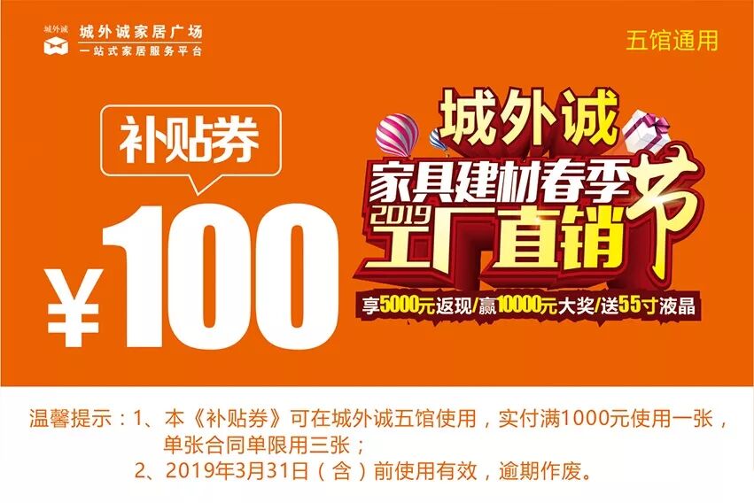 另外,城外诚3月9-10日的“春季工厂直销节”更是优惠力度空前。2月23-3月10日期间,在城外诚五馆购物,单笔合同单实付满3000元,即可参与3月9-10日的大抽奖,抽取最高价值10000元的现金礼券;跨品牌购物3单以上即可享受联单好礼,免费领取电视、冰箱、洗衣机、锅具套餐、扫地套装等好礼;2月27日起,每天早九点,可以通过城外诚微信公众号秒抢补贴;3月9-10日两天购物,可再享受返现抽奖,冲击最高5000元的返现好礼。