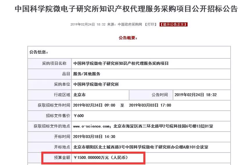 近日,一则“中国科学院微电子研究所知识产权代理服务采购项目公开招标公告”新闻在知识产权圈收到广泛关注和热议。其中,预算金额¥1500万元(人民币)受到广泛关注 。