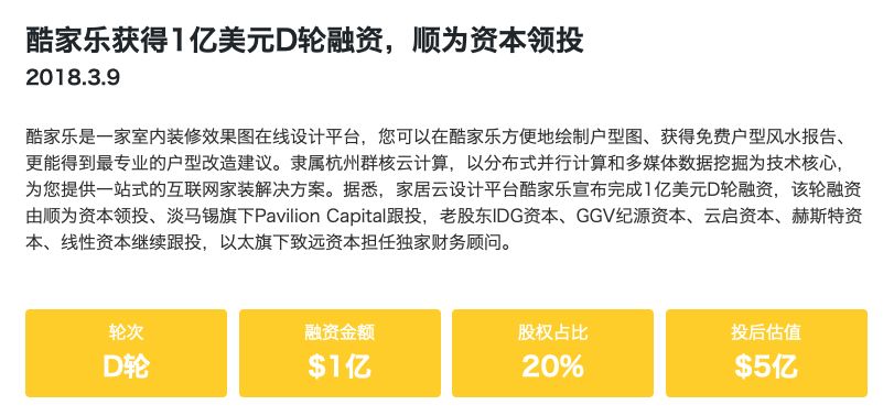 3月9日,家居云设计平台酷家乐宣布完成1亿美元D轮融资,酷家乐估值将达到6亿美金。该轮融资由顺为资本领投、淡马锡旗下Pavilion Capital跟投,老股东IDG资本、GGV纪源资本、云启资本、赫斯特资本、线性资本跟投。融资将用于拓展国际市场,扩大业务版图;完善大数据系统,打造酷家乐云设计平台矩阵;以“杭州中心”、“黄埔研究院”两大研发中心为基,加快科技研发、人才引进。