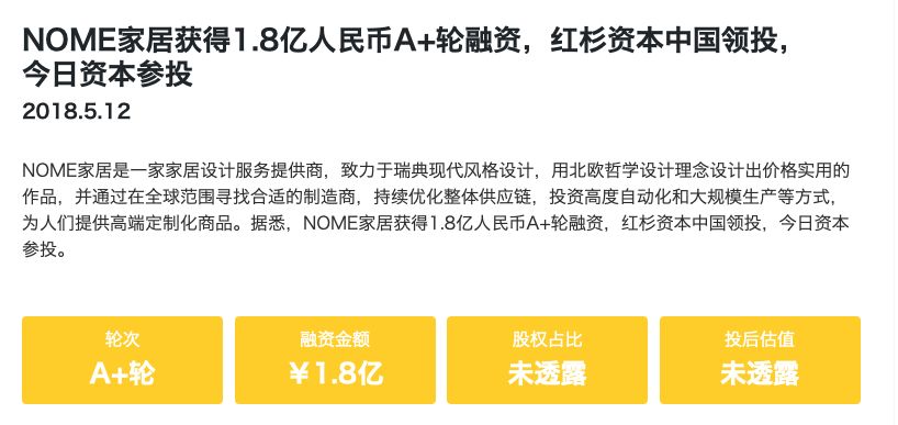 5月12日,生活家居品牌NOME公告称,公司已经完成红杉资本领投、今日资本跟投的1.80亿元人民币A+轮融资。本轮融资前,公司已于2017年完成来自今日资本的2.30亿元投资,当时估值为15亿元。此次融资后未披露估值。