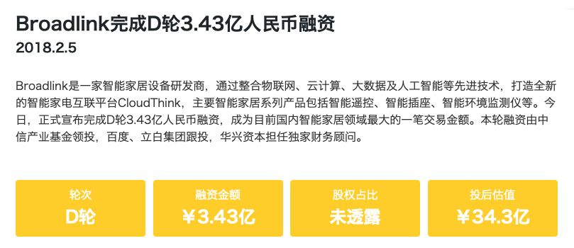 2月5日,杭州古北电子科技有限公司(BroadLink)宣布完成D轮3.43亿人民币融资,成为目前国内智能家居领域当时最大单笔融资,由中信产业基金领投,百度、立白集团跟投。
