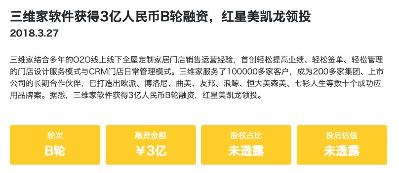 3月27日,互联网云设计平台三维家完成3亿元B轮融资,由红星美凯龙领投。