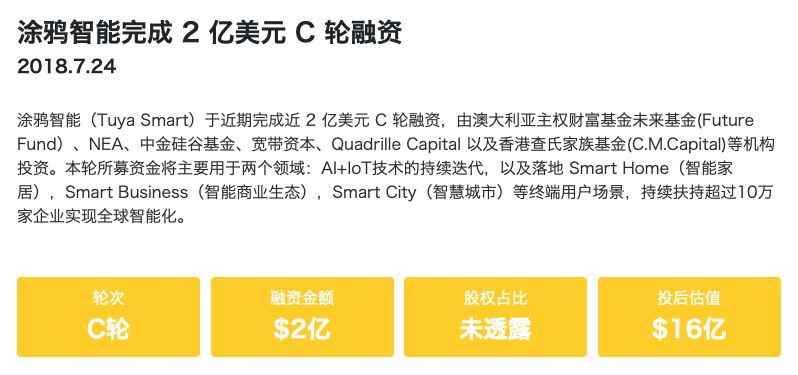7月24日,涂鸦智能(Tuya Smart)完成 2 亿美元 C 轮融资,由澳大利亚主权财富基金未来基金(Future Fund)、NEA、中金硅谷基金、宽带资本、Quadrille Capital 以及香港查氏家族基金(C.M.Capital)等机构投资。