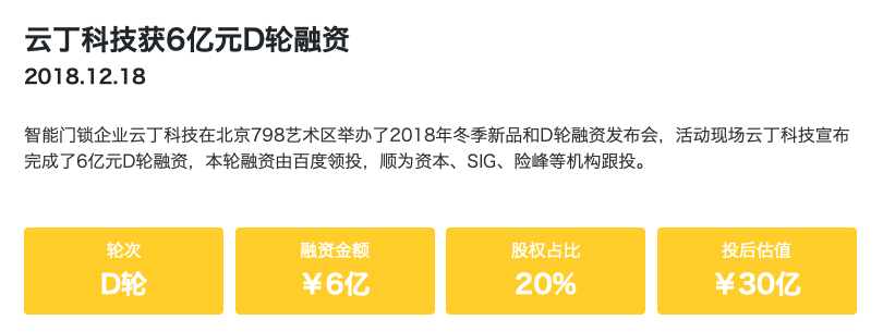 12月18日,智能门锁企业云丁科技公布在11月份完成6亿元D轮融资,由百度领投,顺为资本、SIG、险峰等跟投。