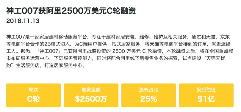 11月13日,家装后市场服务平台「神工007」获得阿里2500万美元C轮战略融资。