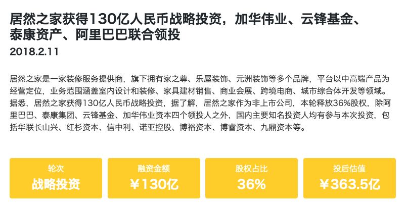 2月11日,居然之家完成了130亿元的战略注资,投资后估值达到363.50亿元,是2018年度最大的一笔融资。