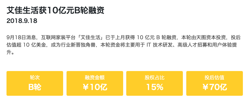 9月18日,互联网家装平台艾佳生活公布,已于8月获得10亿元B轮融资,由天图资本投资,投后估值超10亿美元,融资将主要用于 IT 技术研发、高级人才招募和用户体验提升。