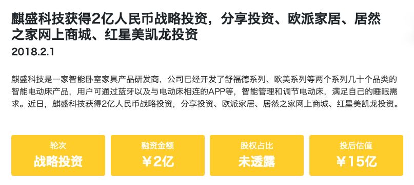 2月1日,麒盛科技宣布完成超2亿元战略融资,投资方为红星美凯龙、分享投资、欧派家居、居然之家等,本轮融资将主要用于扩充产能渠道及拓展销渠道。
