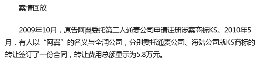 2010年5月,有人以“阿翼”的名义与全润公司(分别委托通麦公司、海陆公司)就KS商标的转让签订了一份合同,转让费用总额显示为5.8万元;