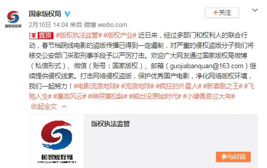 国家版权局:春节档院线电影的盗版传播已得到一定遏制