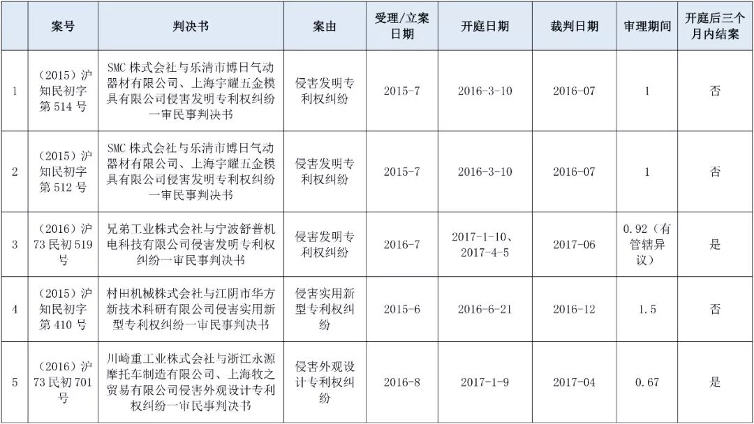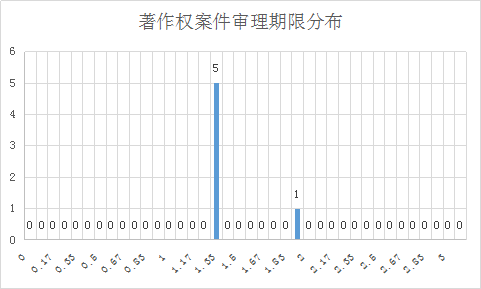 由于理论上,管辖异议会对案件的审理进度产生影响。笔者对案件中管辖异议的情况进行了统计,其中有六个案例(均为上海知识产权法院裁判)存在管辖异议,案件审理平均值为1.42年,与整体数据平均值1.54年相比,可以看出管辖异议对审理进度影响不大。
