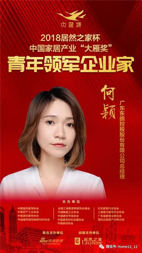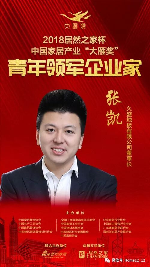 久盛地板张凯、奥普家居吴兴杰、格莱美杨元、依思蒙沙李烨、运时通陈冠翰、东鹏控股何颖、森林之星徐伟、亚细亚陶瓷卢伟佳、蓝景丽家李李、新浪家居魏晓飞,荣获2018“居然之家杯”中国家居产业“大雁奖”青年领军企业家。