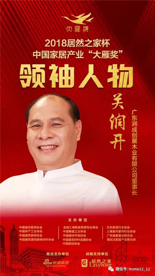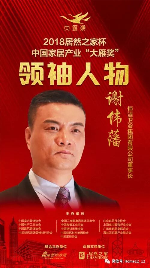 居然之家汪林朋、敏华控股黄敏利、顾家家居顾江生、棋森控股冯琪雅、欧派家居姚良松、九牧厨卫林孝发、美巢集团张经甫、联翔家居卜晓华、合建志洋崔之洋、恒洁卫浴谢伟藩、润成创展关润开、书香门地美学地板卜立新,荣获2018“居然之家杯”中国家居产业“大雁奖”领袖人物。