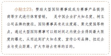 本节小说其实讲的是关于企业宣传商标品牌的事情。应该说赞助大型赛事或成为赛事产品提供商等方式进行体育营销,已经成为中国企业扩大知名度、树立公司品牌的捷径,比如李宁赞助CBA篮球联赛。尤其是国际赛事,具有关注度高、聚光度强等特点,通过大型国际赛事可以短时间之内使企业得到最大限度的曝光,从而达到扩大知名度、宣传公司品牌、拉近企业与受众距离、扩大市场占有率的目的,联想等企业也是这方面的代表。
