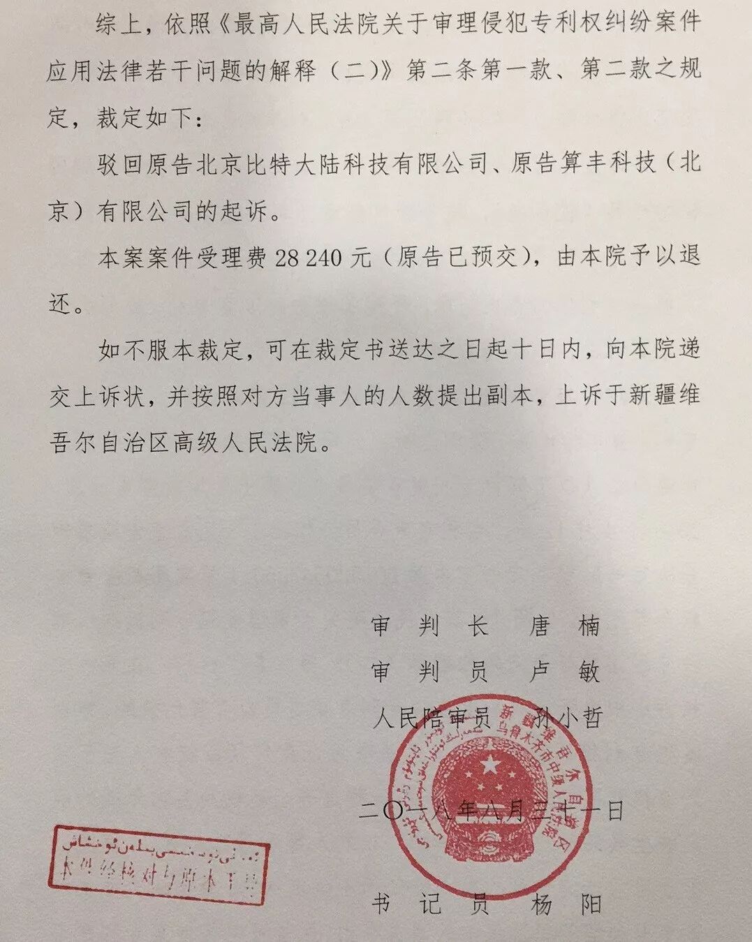 裁定驳回原告北京比特大陆科技有限公司(以下简称比特大陆)、原告算丰科技北京有限公司(以下简称算风科技)的起诉,原因是该案争议被国家知识专利复审委员会判定无效,该诉讼也就无法成立,故驳回原告请求。