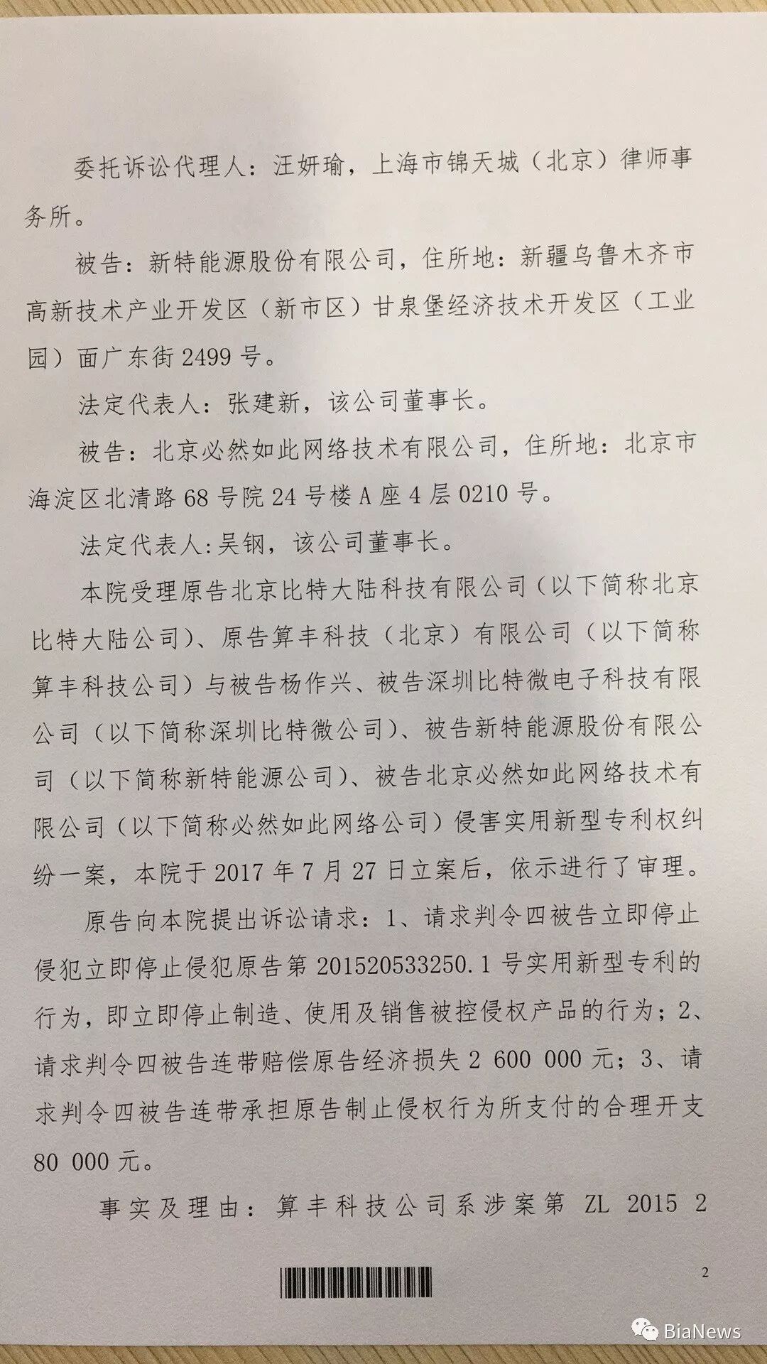 比特微代理张律师告诉Bianews,该案虽早在2017年7月27日就已被新疆维吾尔自治区乌鲁木齐中级人民法院,但因专利被认为是无效,并未开庭审理。