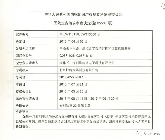 IPRdaily导读:据报道,日前,经历一年多的专利侵权诉讼终于有了结果,比特大陆诉讼4被告侵犯专利权的要求被驳回。原因是该案争议被国家知识专利复审委员会判定无效,该诉讼也就无法成立,故驳回原告请求。矿机行业的竞争进入了白热化状态。国内有比特大陆、嘉楠耘智、翼比特、神马矿机、芯动科技等公司,英特尔、三星等传统芯片设计商也似乎要进军这个行业。