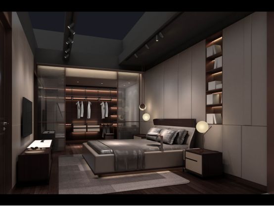 卧房空间同样展现出一种东方情怀,“和而不同,各得其所”,每一个角落,都精心布置,细细打磨,让生活回归到自然平和的舒适状态。床屏的设计灵感来源于传统建筑的房檐与屋脊,通过天马行空的想象以韵味十足的形象呈现;床架旁配有折叠桌板,可供看书及浪漫早餐之用;卧室电视柜内嵌有蓝牙音箱,一天美好新生活,从开启视听娱乐开始。