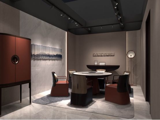 “坤伦”系列对中国元素捕捉极其敏锐,通过对传统文化的解读,以现代人的审美需求将中国传统文化意境融入到设计中:条桌以加工中药的器具——药碾子为设计灵感,以现代手法提炼呈现,一器一物,皆于方寸之间,尽显乾坤;餐边高柜,借鉴中式中轴对称之美,中心环形拉手亦有双手合十的意境在其中。圆形餐桌采用双层台面,有很多精妙体贴设计,如电动隐藏式的调味盒。整体设计中舍弃了繁复花哨的雕花装饰等,在色彩层次和线条处理上,极力表现出现代中式家具本身的美感与实用性。