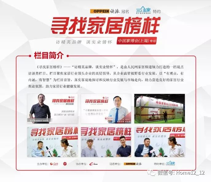 《寻找家居榜样》——“访精英品牌,谈实业情怀”,是由人民网家居频道倾力打造的一档观点访谈类栏目。栏目聚焦家居行业领头企业的高层领导,从企业高管视野看行业发展,真实客观地探讨行业发展与市场走向,营造良好家居行业舆论氛围,助力家居行业健康发展。