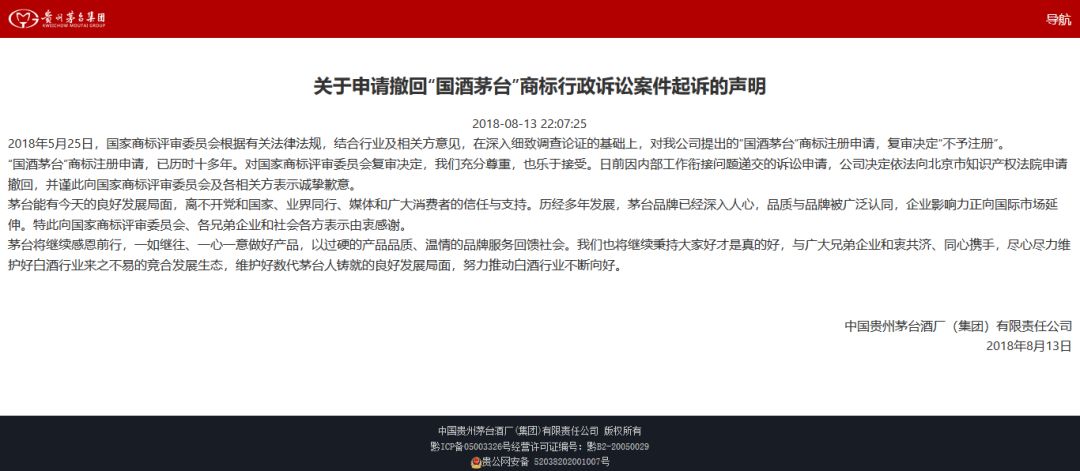 8月13日晚间,贵州茅台集团官网刊登一则关于申请撤回“国酒茅台”商标行政诉讼案件起诉的声明,并“向国家商标评审委员会及各相关方表示诚挚歉意”。