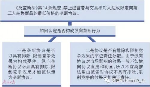 王晓明:《反垄断法》第14条规定,禁止经营者与交易相对人达成限定向第三人转售商品的最低价格的垄断协议。如何认定是否构成纵向垄断行为,在司法层面尚不能机械从条文字面上进行判断,重点应从两个方面来进行分析: