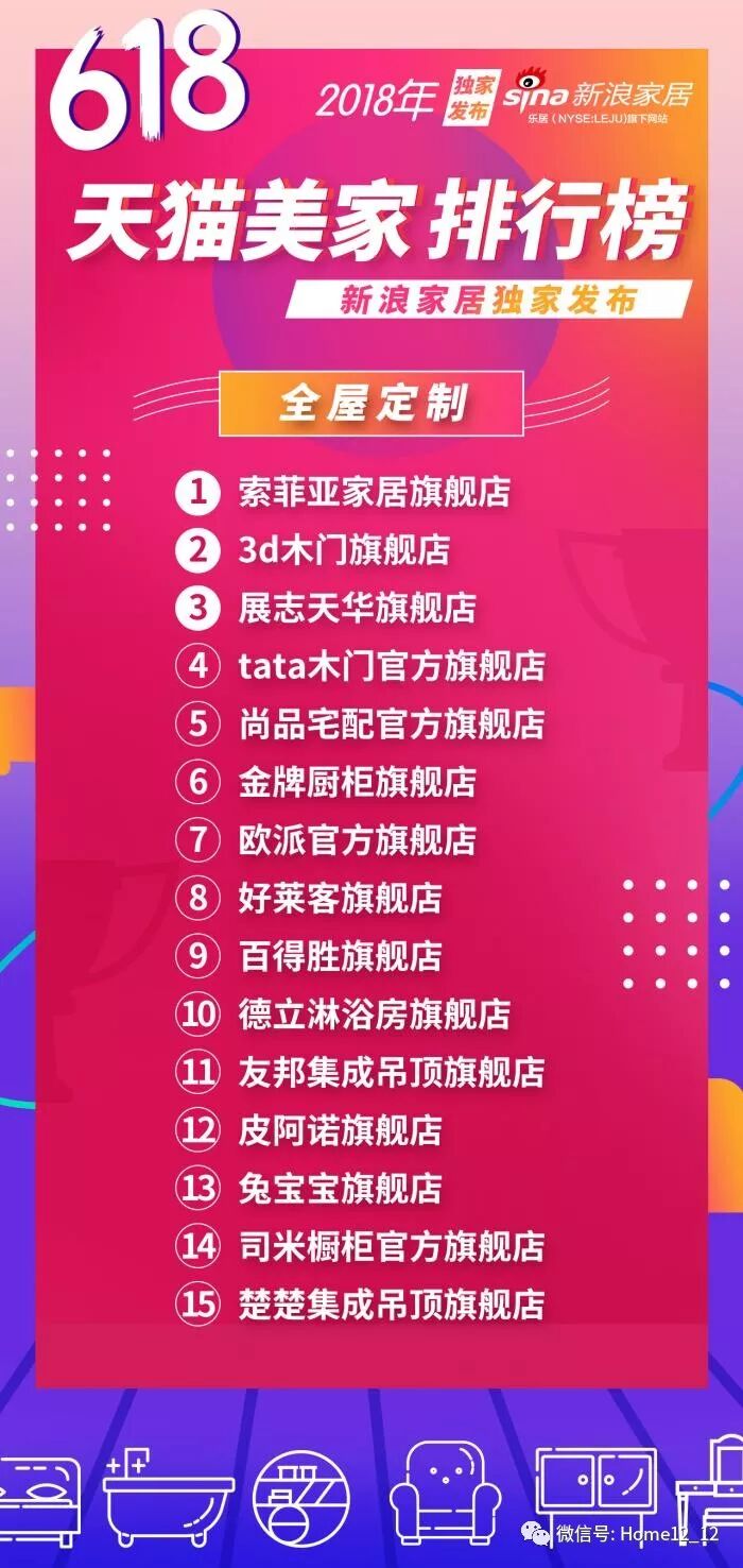 2011年上市的索菲亚,率先提出“定制”的概念,不断深化大家居战略,产品囊括索菲亚全屋定制、司米橱柜、米兰纳木门、索菲亚家具家品等,为消费者提供便捷的一站式大家居一体化解决方案,得到了越来越多人的认可。本次618天猫美家零售榜,索菲亚家具旗舰店摘得冠军。3d木门旗舰店、展志天华旗舰店、tata木门官方旗舰店、尚品宅配官方旗舰店分别位列第二至第五名。在全屋定制的二级类目中,诺贝尔瓷砖官方旗舰店摘得建材和瓷砖行业的双榜首位;地板行业的第一名则由大自然官方旗舰店获得;友邦集成吊顶旗舰店领先其他品牌,赢得集成吊顶销售榜单的首位;晨阳水漆旗舰店获涂料行业销售榜冠军;墙纸销售榜首位由米素旗舰店摘得;浴霸卖的最好的则是奥普官方旗舰店;除此之外,板材方面兔宝宝旗舰店当仁不让,拔得头筹;油漆榜第一名则是雨虹旗舰店;配件专区销售榜单同样一片飘红,众力高旗舰店获得榜单首位!全屋定制销售额整体看好!