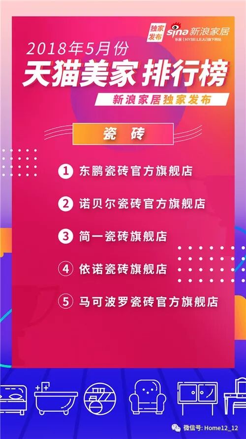 【瓷砖】瓷砖品类的排名向来非常激烈,在5月战表中,东鹏瓷砖官方旗舰店略胜一筹,取得冠军。诺贝尔瓷砖官方旗舰店获得第二名,简一瓷砖旗舰店、依诺瓷砖旗舰店、马可波罗瓷砖官方旗舰店分别获得第三、四、五名。
