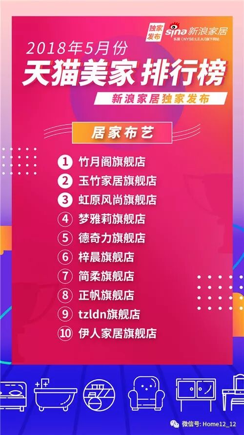 【居家布艺】居家布艺你能想到什么?无纺防水布、凉席凉垫、沙发套?没错!主打销售无纺布、防水布的竹月阁旗舰店位居第1,主打销售凉席、凉垫的玉竹家居旗舰店仅次之,位于第2,主打销售沙发套的虹原风尚旗舰店位于第3,主打销售凉席、凉垫的梦雅莉旗舰店位于第4,主打销售防蚊门帘的德奇力旗舰店则位居第5。