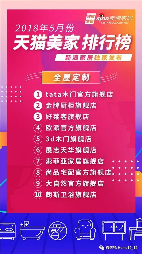 【全屋定制】TATA木门官方旗舰店斩获门窗类目和全屋定制行业双冠军,在过去的瑞典世乒赛中,TATA木门作为中国家居建材行业第一个走出国门的官方赞助商大放异彩,并成为续约三年世乒赛的赞助商,TATA木门要让世界看到“中国制造”,在消费者端引燃品牌效应,完成销售的持续爆发,金牌厨柜旗舰店获全屋定制行业亚军,由金牌厨柜发起的“中国爱厨日”全国性厨房公益活动在5月举行,倡导人们为家人下厨,回归家的亲情,养成回家吃饭的健康生活方式!金牌厨柜重新定义中国专业厨柜标准深受消费者喜爱;好莱客旗舰店获季军,好莱客在5月上线了融合现代工艺于与东方文化的新中式家居系列,该系列产品一经上市就刮起了一阵全屋定制的中国风,产品备受市场青睐。欧派官方旗舰店获第4名,欧派在全屋定制领域的市占率一直在持续提升,以专业技术和一流的服务赢得了消费者。3d木门旗舰店荣获第5名,品牌理念和新零售的布局,让3D木门成为了全屋定制领域的明星产品。随着居民消费水平全面升级和一站式服务的流行,传统家居建材市场的消费环境正在悄然发生变化,“全屋定制”已然成为趋势,值得期待