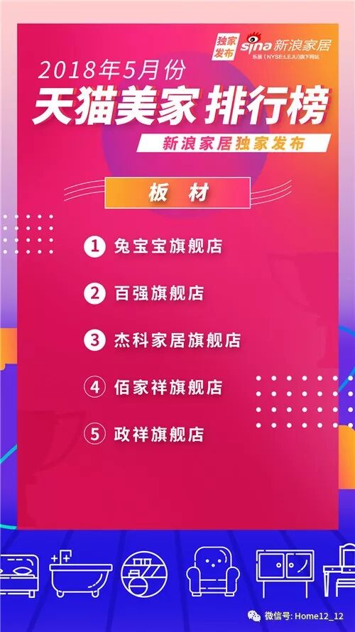【板材】板材是众多家具的支撑,来看看5月份板材界的“国家队”都取得了什么好成绩?主打免漆生态板的兔宝宝旗舰店获得第一名,北京老字号百强旗舰店获得第二名。剩下三位:杰科家居旗舰店、佰家祥旗舰店、政祥旗舰店紧随其后,分别获得第三四五名。