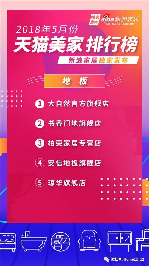 【地板】大自然官方旗舰店一直是地板品类的常胜将军,5月也获得了第一名的好成绩。书香门第旗舰店主打美学地板,这个月也斩获亚军。季军被一家以地板革为主体的店铺——柏荣家居专营店获得。安信地板旗舰店、琼华旗舰店获得第四、五名好成绩。