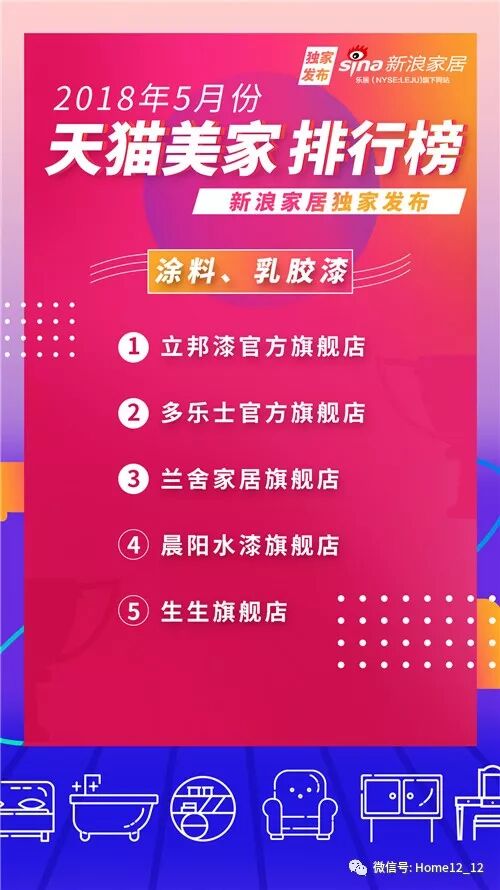 【涂料、乳胶漆】涂料是家庭中使用面积最大的产品,很多品牌都推出一站式省心刷漆服务以吸引客户。5月份涂料行业竞争激烈,立邦漆官方旗舰店拔得头筹;多乐士官方旗舰店、兰舍家居旗舰店、晨阳水漆旗舰店、实力也不一般,皆是全屋定制榜的老将,它们胜不骄、败不馁,分别排名第二、三、四名。生生旗舰店名列第五。