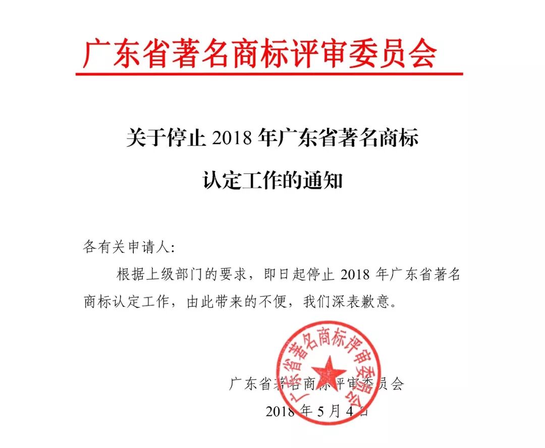 2018年广东省著名商标认定工作停止通知!