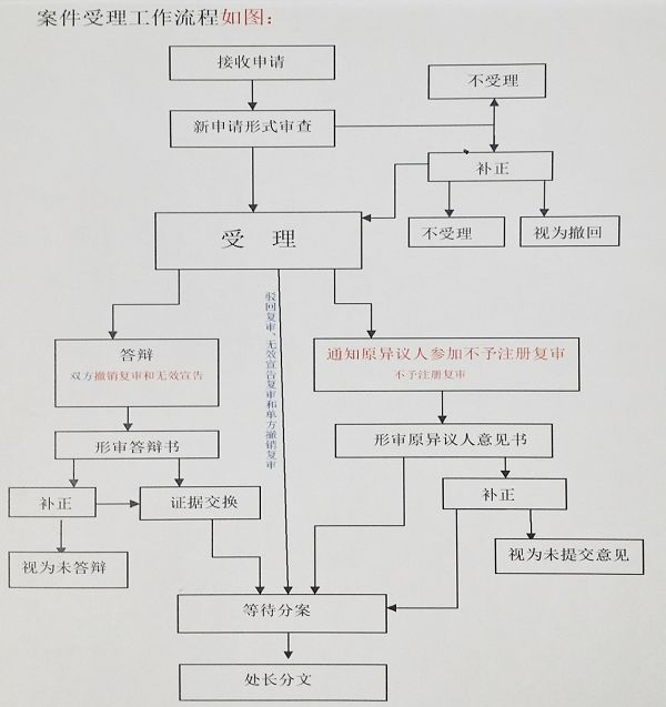 商评委的评审流程有四个阶段:第一阶段,当事人提交复审申请,或者当事人委托代理机构提交申请;第二阶段,受理处进行形式审查,形式审查合格的,发受理通知书;第三阶段,实质审查,之后发裁定书;第四阶段,对裁定结果不服的到法院提起诉讼,判决后再依判决进行裁定。一个案子到了受理处之后,为什么停留那么长时间?因为从接受申请到形式审查过程复杂,以下是评审案件形式审查流程图。