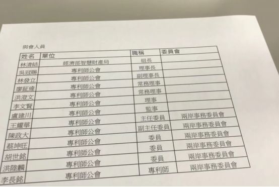专利师为台湾地区专利从业之专门证照。台湾专利师公会也可以理解为台湾专利代理人协会,成立于2009年,其工作内容为有关于专利实务作业以及各国专利制度、法令研究推广等各类事项。当天台湾智慧财产局林清结组长,台湾专利师公会吴冠赐理事长以及台湾资深知识产权服务机构的负责人代表出席交流会。双方代表用时一下午探讨双方未来如何进一步深入合作。
