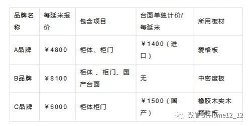 以B品牌和C品牌为对比,B品牌整体报价虽高,但包含台面、4个抽屉拉篮和水盆、龙头;而C品牌整体价格虽低,但台面、抽屉拉篮、水盆龙头都要单独计费。
