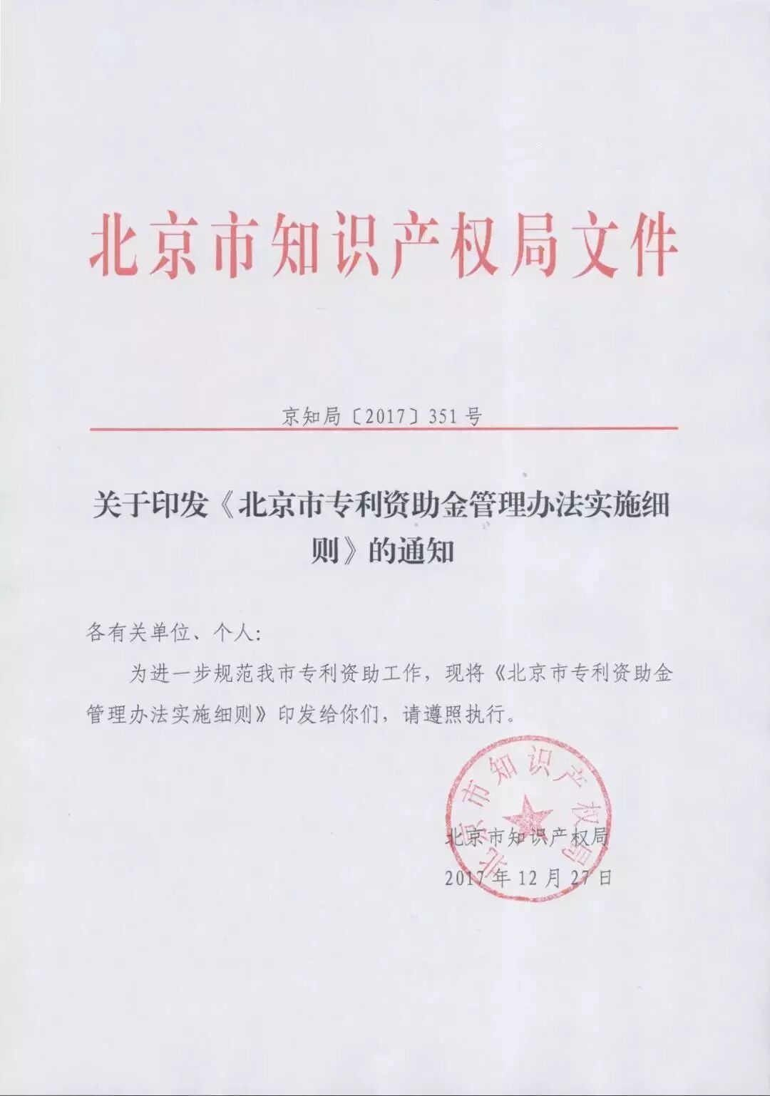 关于印发《北京市专利资助金管理办法实施细则》的通知