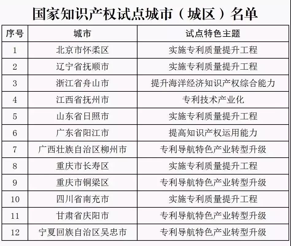 / 12个城市(城区)确定为国家知识产权试点城市