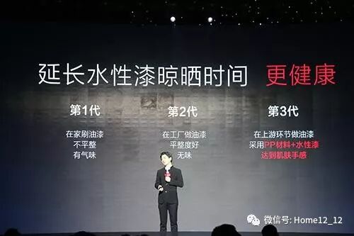 新产品告别了第一代油漆工艺的粗糙(第一代油漆工艺在客户家里进行,满房间都是油漆味道,涂刷也不够平整);告别了第二代油漆工艺的冰冷手感(第二代油漆工艺在工厂进行,平整度、观感和环保性都很好,但手感有些冰冷),面层采用广泛应用到打包盒、奶瓶、汽车仪表板等领域的食品级可塑PP材料,生产原材料采用欧洲E-1环保标准的德国“绍尔兰特”桥洞力学板材,并在上游环节做油漆,延长水性漆晒凉时间,最终达到肌肤手感。