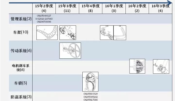 该公司最早申请的专利是管理系统和车架,其中对于车架(包括整车以及挡泥板等部件的外观设计)给予了较为持续的关注;随着时间推移,关注点又逐渐涉及到传动系统、车锁和防盗系统等等;2016年以来,则重点关注了电机刹车系统的方向,就该领域先后提出总共6件相关申请。对于该公司,管理系统可以说是重点技术也是商业盈利模式的核心,通过管理系统实现用户信息、车辆信息的安全管理,最终获利。可以发现该公司在管理系统方面同时递交了PCT国际专利申请,为考虑进入国外市场进行准备。