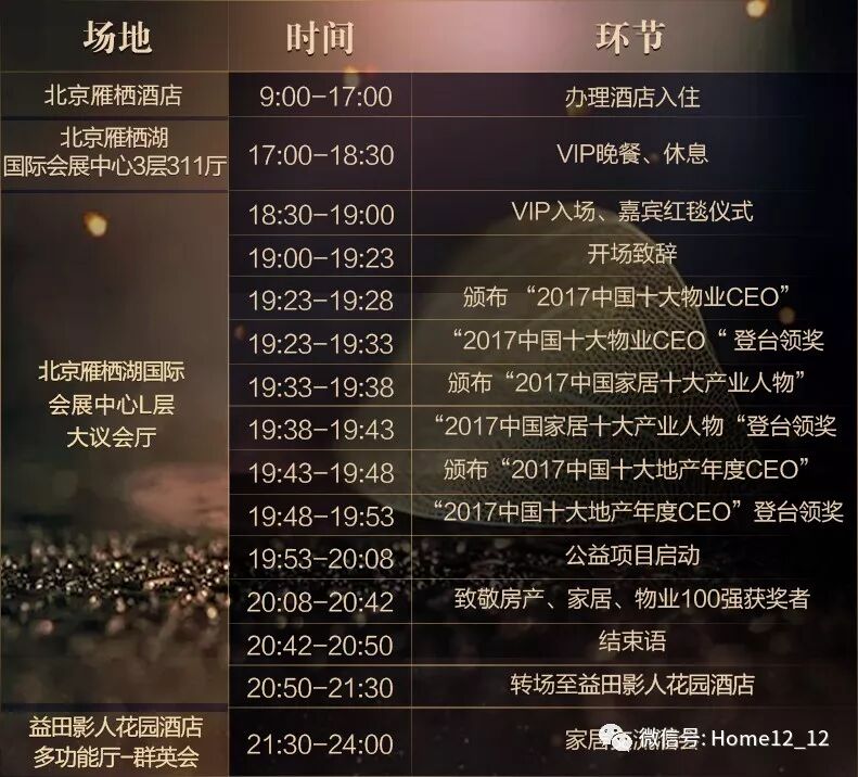 历时百日,覆盖百城,全国两百多位专家评审,对千名房地产、家居、物业三大行业中的CEO和职业经理人进行了公正、客观、专业评选,向“城市脊梁”们致敬。“2017中国十大地产年度CEO”、“2017中国地产经理人100强”、“2017中国家居十大产业人物”、“2017中国家居品牌经理人100强”、“2017中国十大物业CEO”、“2017中国100标杆社区物业经理”等六大奖项将在盛典上发布荣耀榜单。