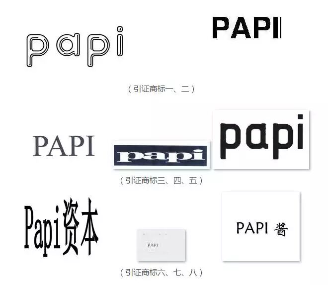 “papi酱”系列商标系由原告泰洋川禾文化传媒徐州有限公司经“网红”papi酱(真名姜某)授权申请注册。在该系列案件中,原告将“papi酱”作为商标申请注册在第9类、第25类、第35类、第38类等指定商品或服务上。被告商标评审委员会经审查认定:诉争商标在第9类上与第19182879号“papi”商标(简称引证商标一)、国际注册的第1071421号“PAPI”商标(简称引证商标二)构成近似;诉争商标在第25类上与第3630646号“PAPI”商标(简称引证商标三)、第9934704号“papi”商标(简称引证商标四)构成近似;诉争商标在第35类上与第6541464号“papi”商标(简称引证商标五) 、第19415385号“papi资本”商标(简称引证商标六)、国际注册第683237号“PAPI”商标(简称引证商标七)构成近似;诉争商标在第38类上与第19353802号“PAPI酱”商标(简称引证商标八)构成近似。据此,被告驳回了诉争商标的注册申请。